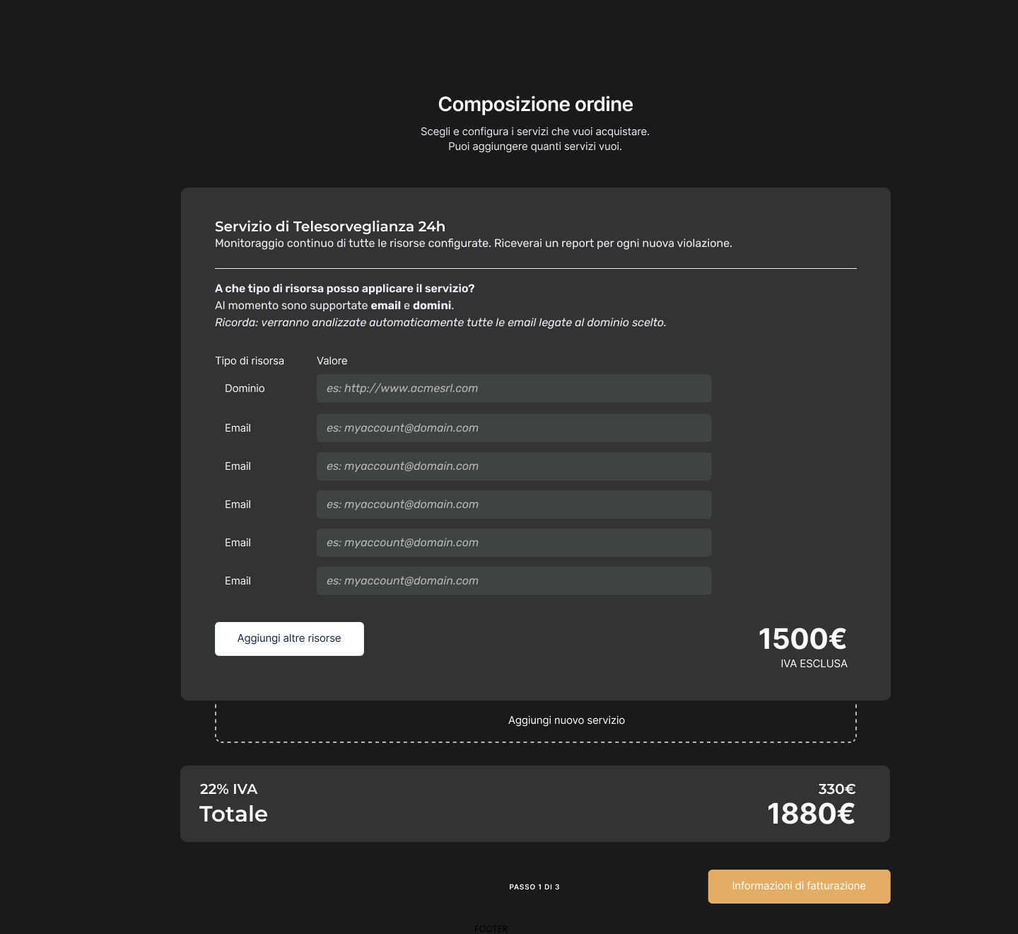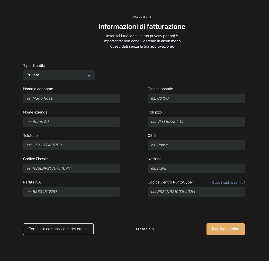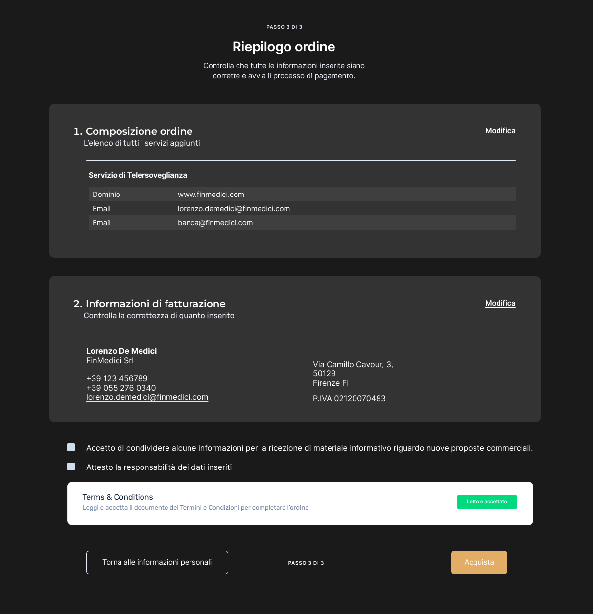 Una volta completata la configurazione l’utente clicca su “Acquista” e può iniziare così il processo di acquisto, diviso in 3 passi: