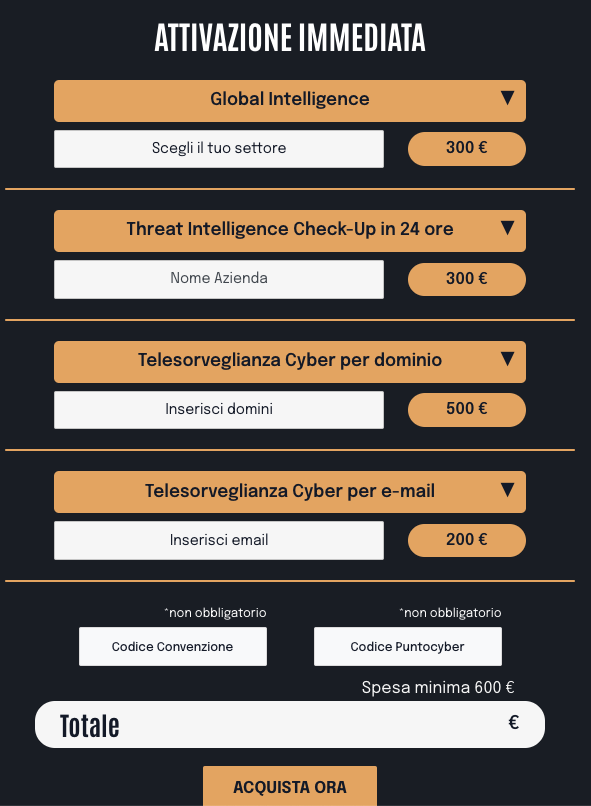 Sarà possibile per il cliente scegliere anche il servizio di Telesorveglianza Cyber inserendo il proprio dominio al costo di 500 euro cadauno.