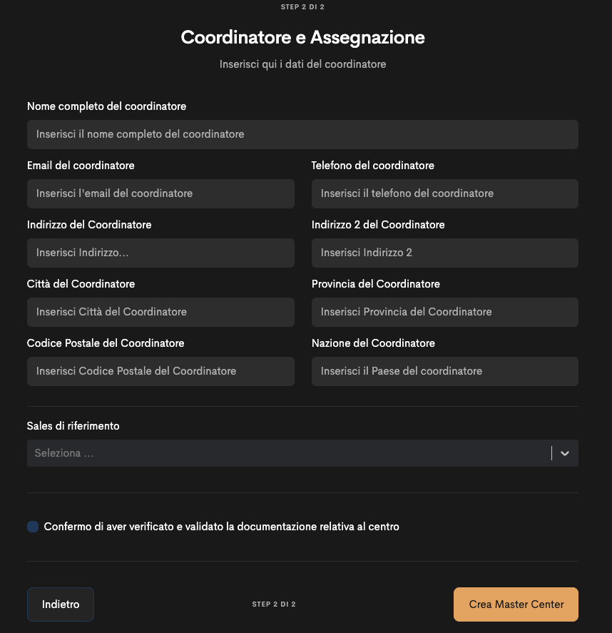 Cliccando su “Crea Master Center” si inserisce il nuovo Centro Master nel sistema.