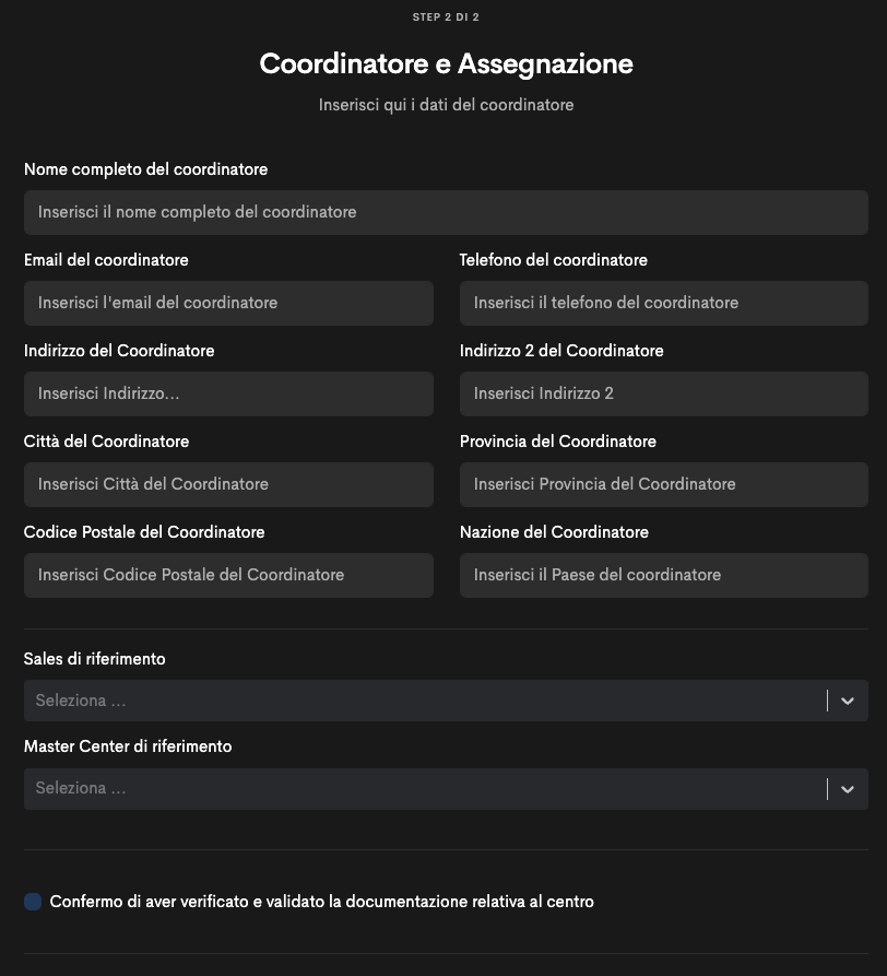 I parametri del coordinatore non sono tutti obbligatori. Infatti si può completare l’inserimento omettendo l’indirizzo.